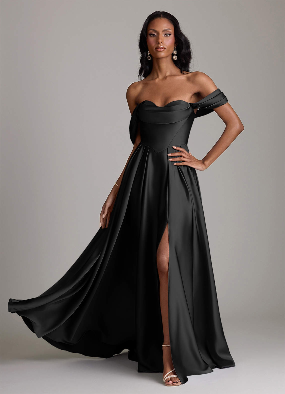 Abito A-Line in Raso Elasticizzato a Spalla Scoperta Nero