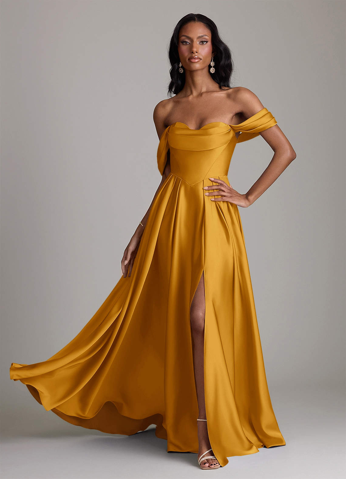 Abito A-Line in Raso Elasticizzato a Spalla Scoperta Caramello