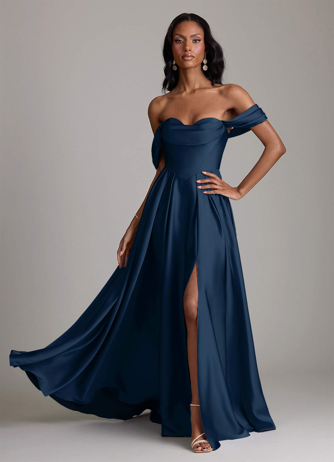Abito A-Line in Raso Elasticizzato a Spalla Scoperta Marino Scuro