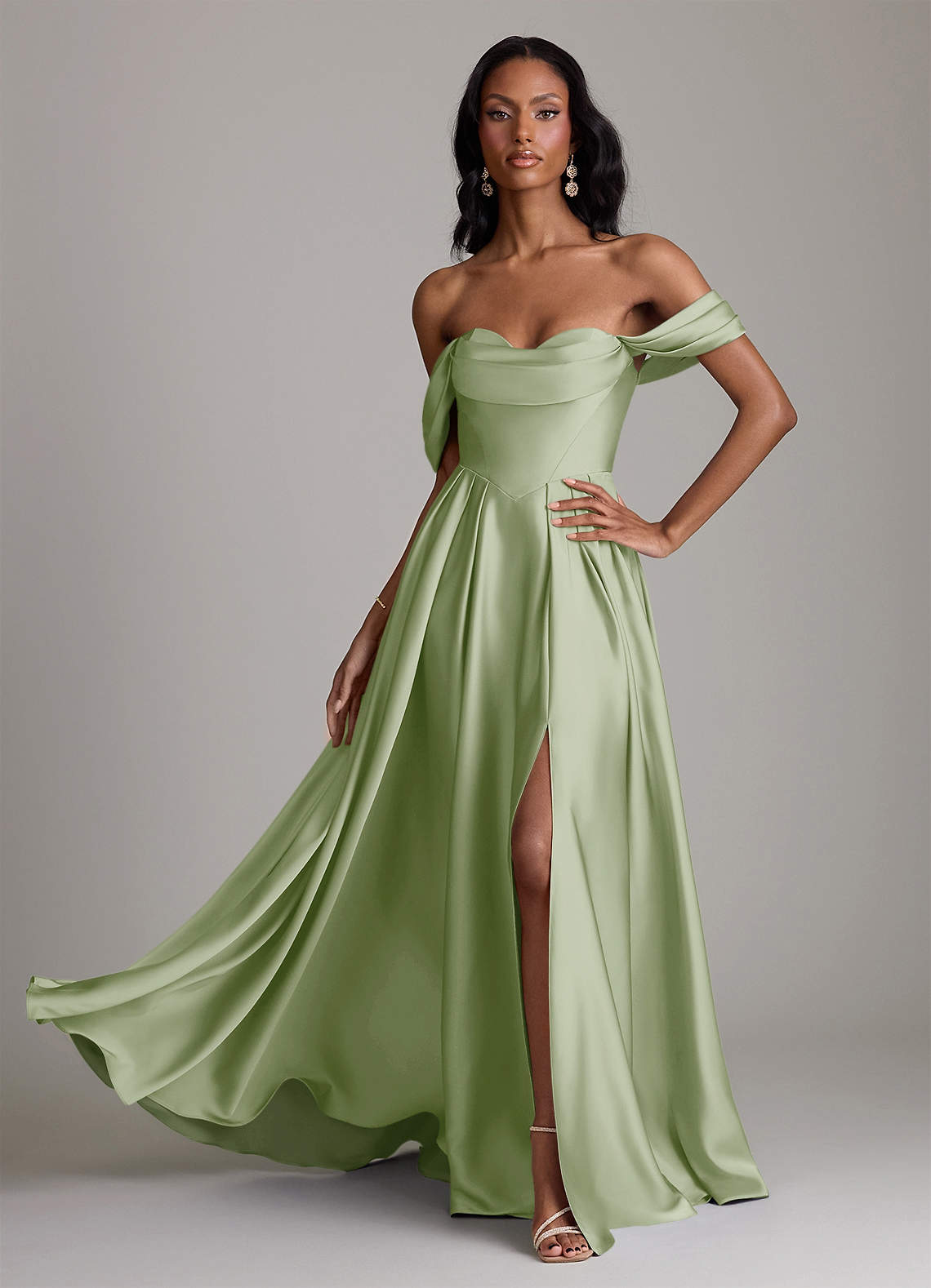 Abito A-Line in Raso Elasticizzato a Spalla Scoperta Verde Salvia