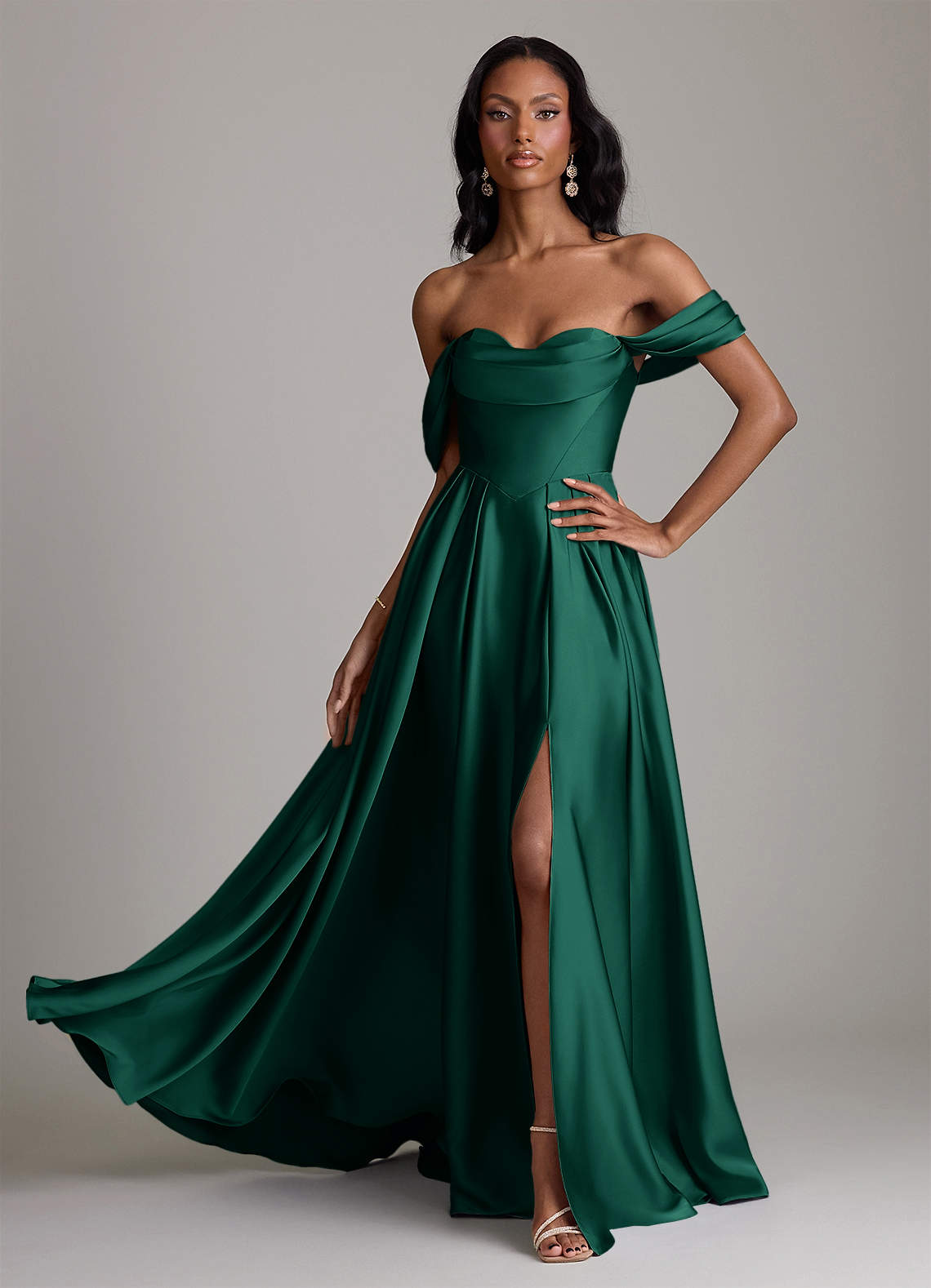 Abito A-Line in Raso Elasticizzato a Spalla Scoperta Smeraldo