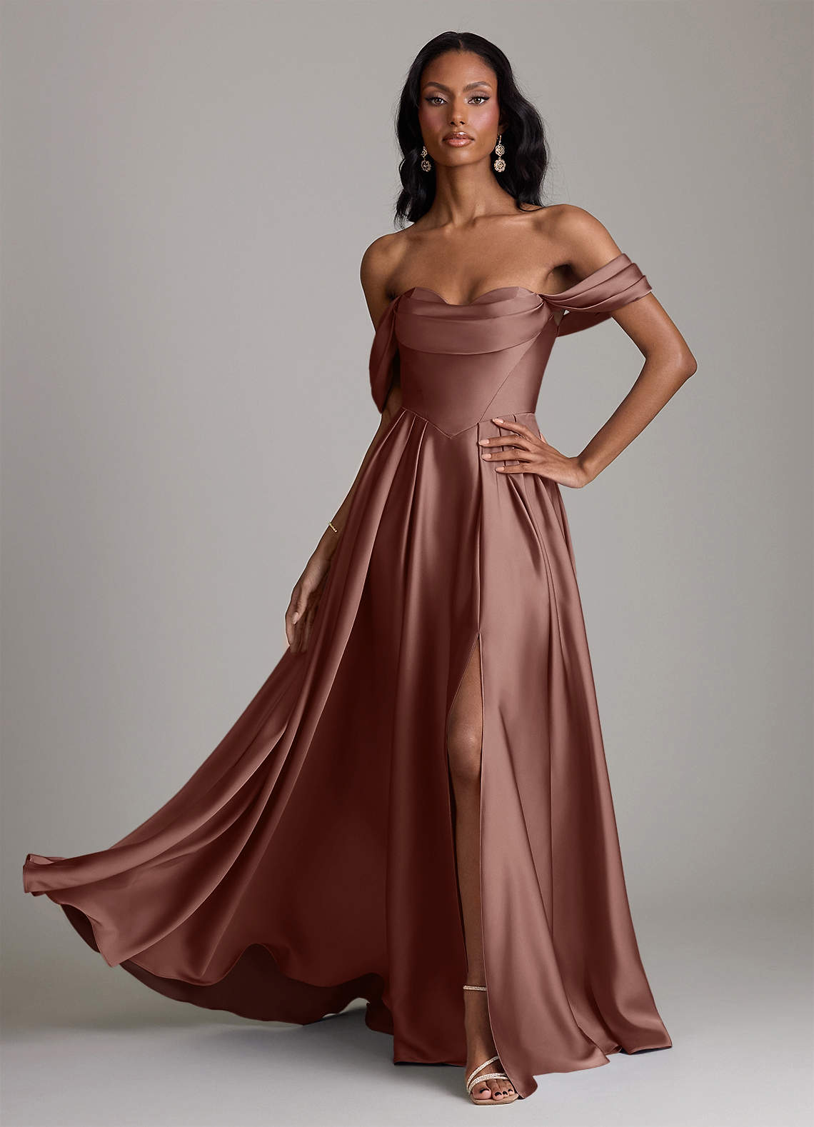 Abito A-Line in Raso Elasticizzato a Spalla Scoperta Espresso