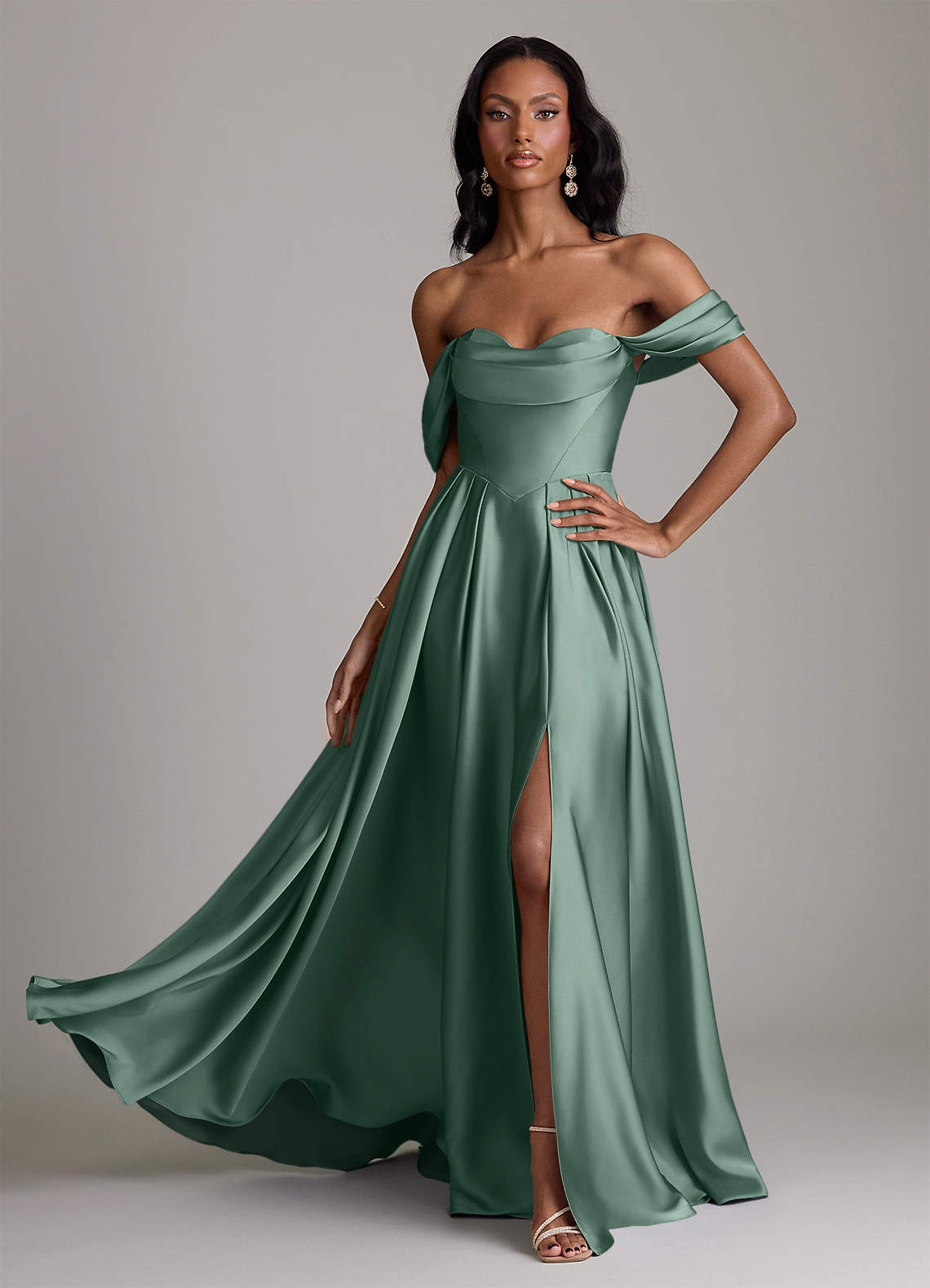 Abito A-Line in Raso Elasticizzato a Spalla Scoperta Eucalipto