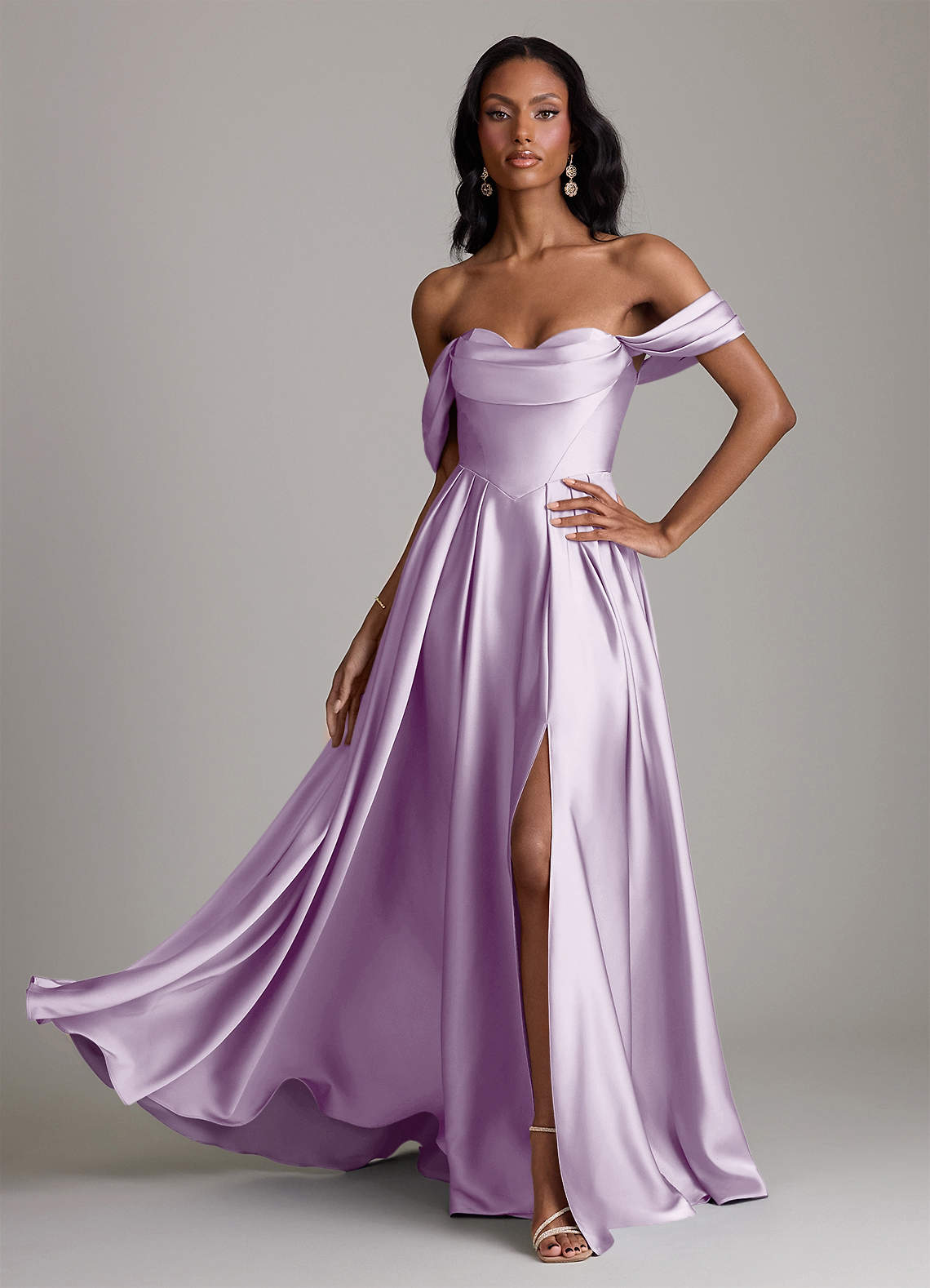 Abito A-Line in Raso Elasticizzato a Spalla Scoperta Lilla Glassato
