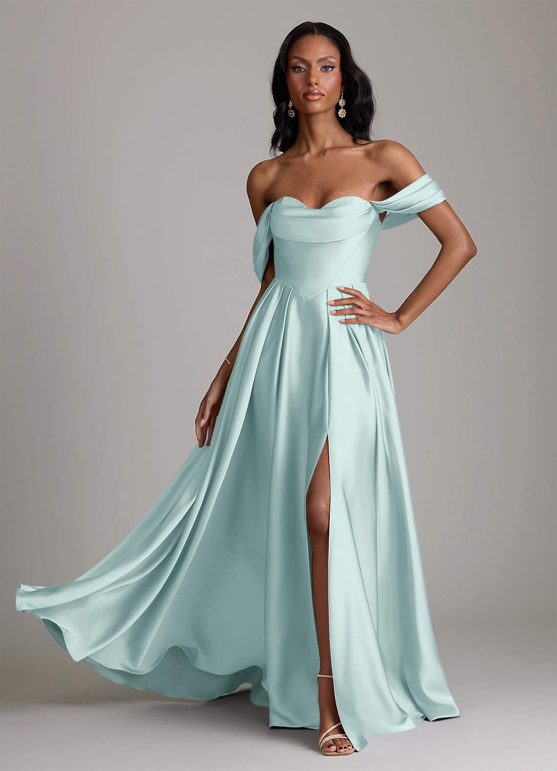 Abito A-Line in Raso Elasticizzato a Spalla Scoperta Nebbia