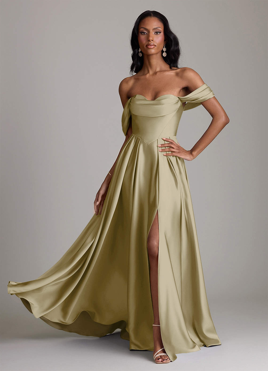 Abito A-Line in Raso Elasticizzato a Spalla Scoperta Verde Muschio