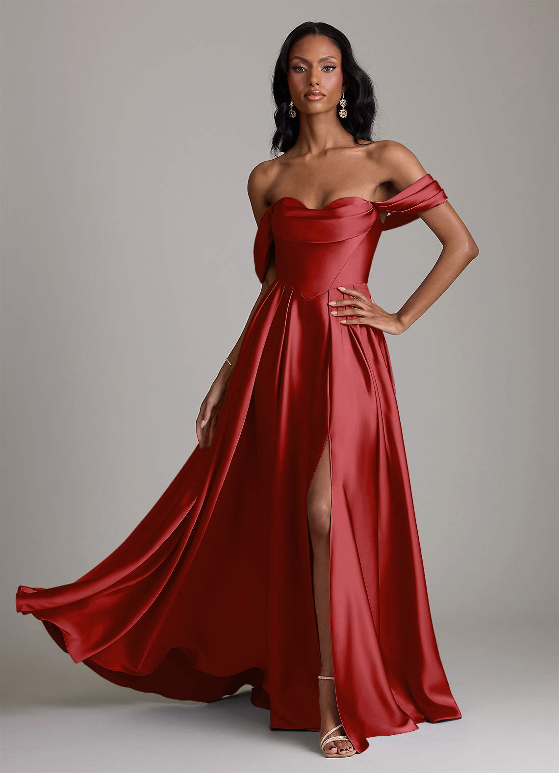 Abito A-Line in Raso Elasticizzato a Spalla Scoperta Melograno