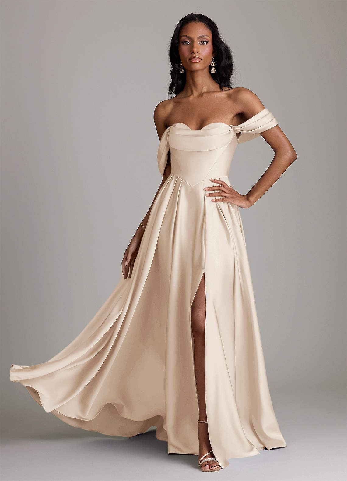Abito A-Line in Raso Elasticizzato a Spalla Scoperta Alabastro Bianco