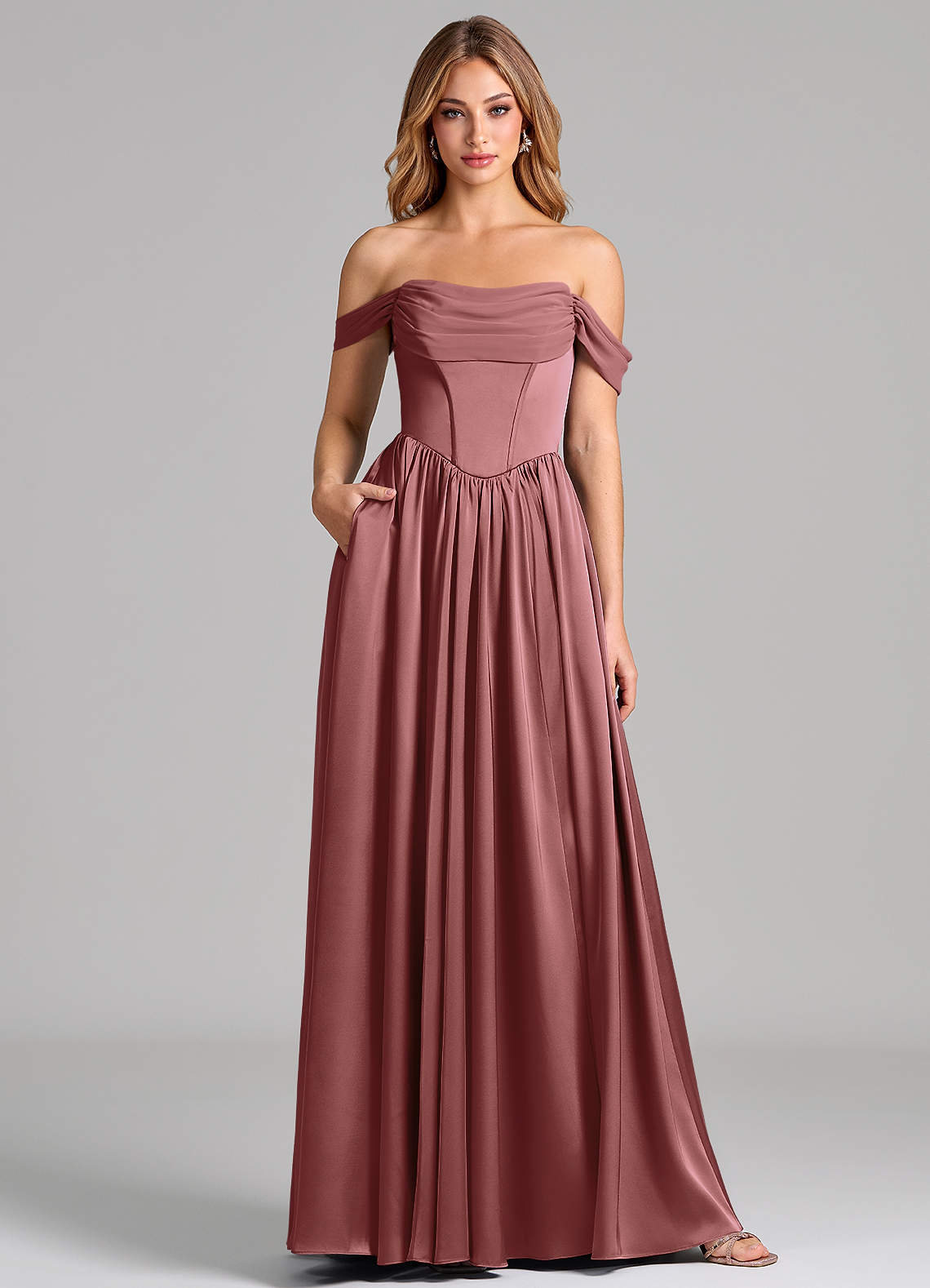 Abito A-Line in Raso Elasticizzato a Spalla Scoperta Ametista