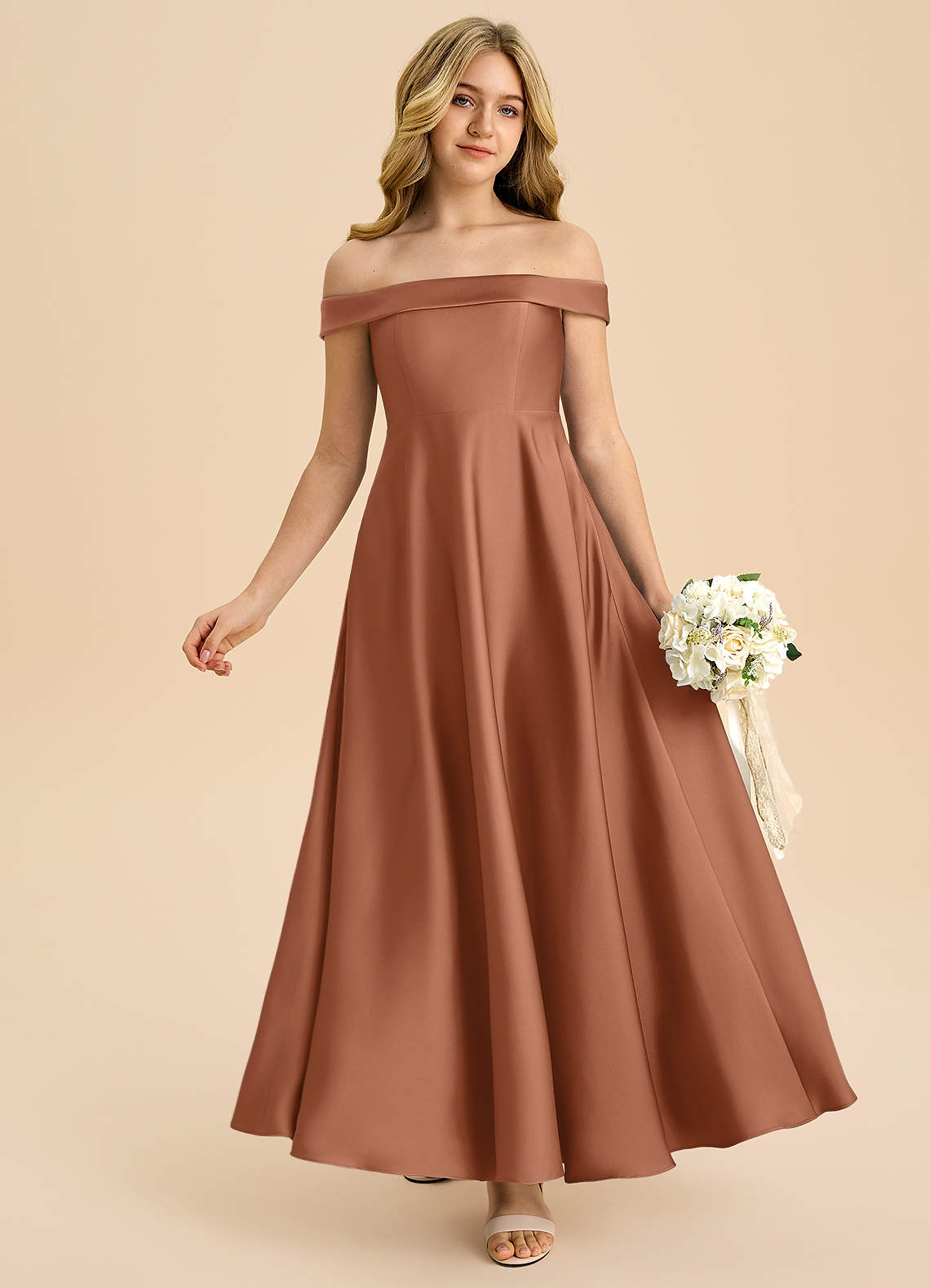 Abito A-Line in Raso Elasticizzato a Spalla Scoperta Bronzo