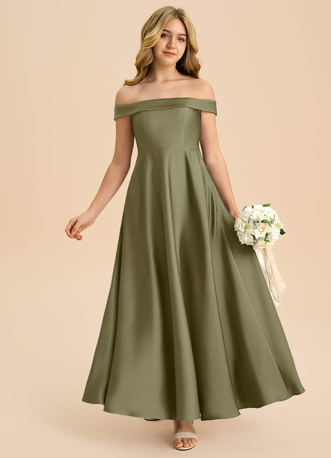 Abito A-Line in Raso Elasticizzato a Spalla Scoperta Pistacchio