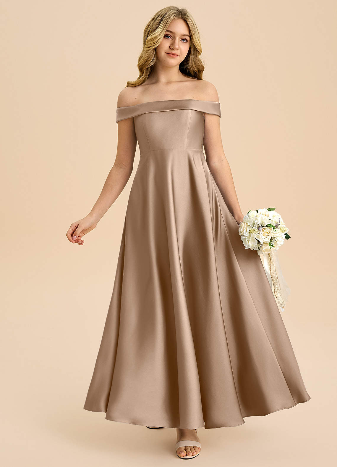 Abito A-Line in Raso Elasticizzato a Spalla Scoperta Taupe