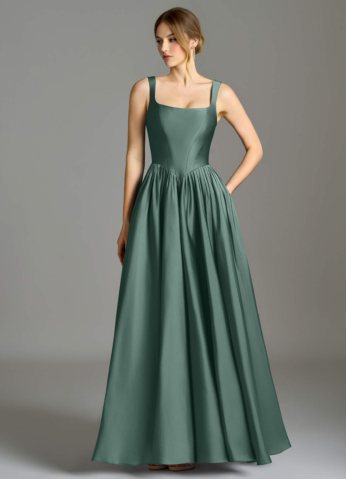 Abito A-Line in Raso Elasticizzato Plissettato Eucalipto