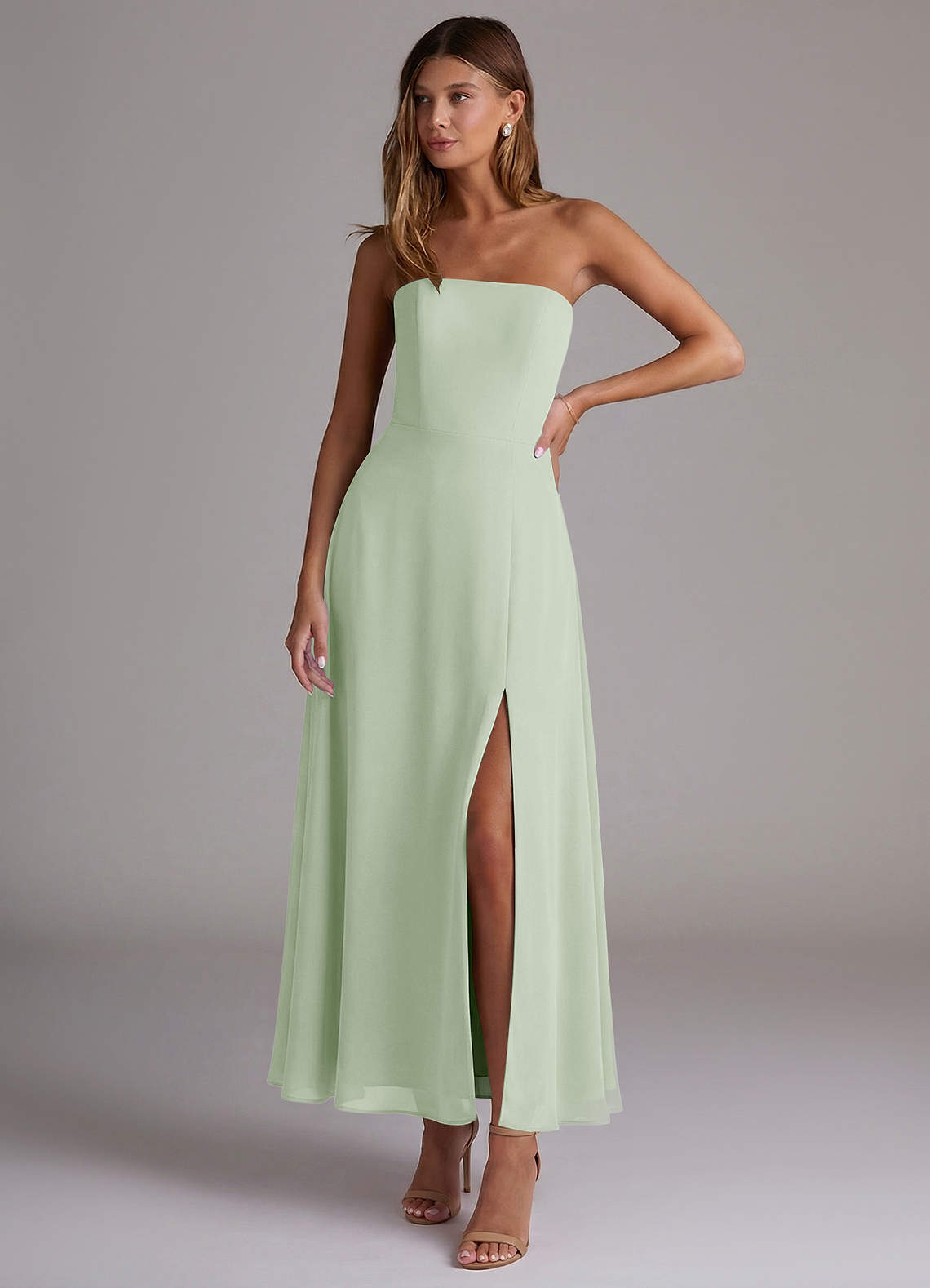 Abito A-Line in Chiffon Senza Cinturino Verde Salvia