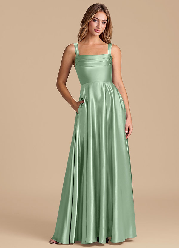 A라인 주름진 메탈릭 새틴 바닥 길이 드레스