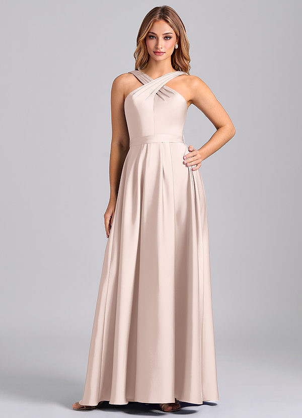 A라인 주름진 스트레치 새틴 바닥 길이 드레스