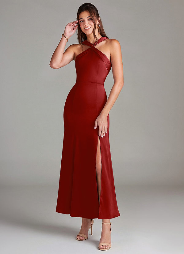 I chose pomegranate for my bridesmaids because it complemented by ivory dress and champagne colored shoes. I also wanted my bouquet to be pomegranate as my bridesmaids dresses to have some coordination. They all looked very elegant Azazie Maggie which complemented all their different skin tones and body types.
