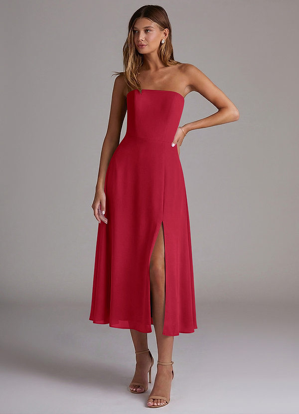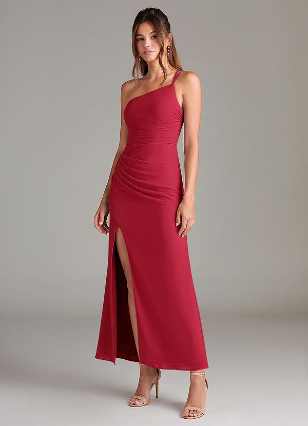 I chose scarlet because it reminded me of old Hollywood. I wanted to go for a classic glam wedding theme so my bridesmaids wore the Azazie Kelly. Scarlet was a classic color that looked very sophisticated and chic. We accessorized the dress with white pearls for a finishing touch.