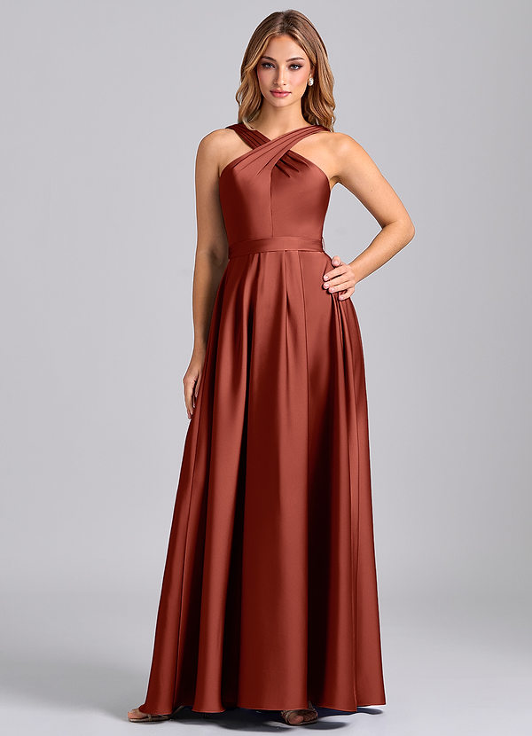 A라인 주름진 스트레치 새틴 바닥 길이 드레스