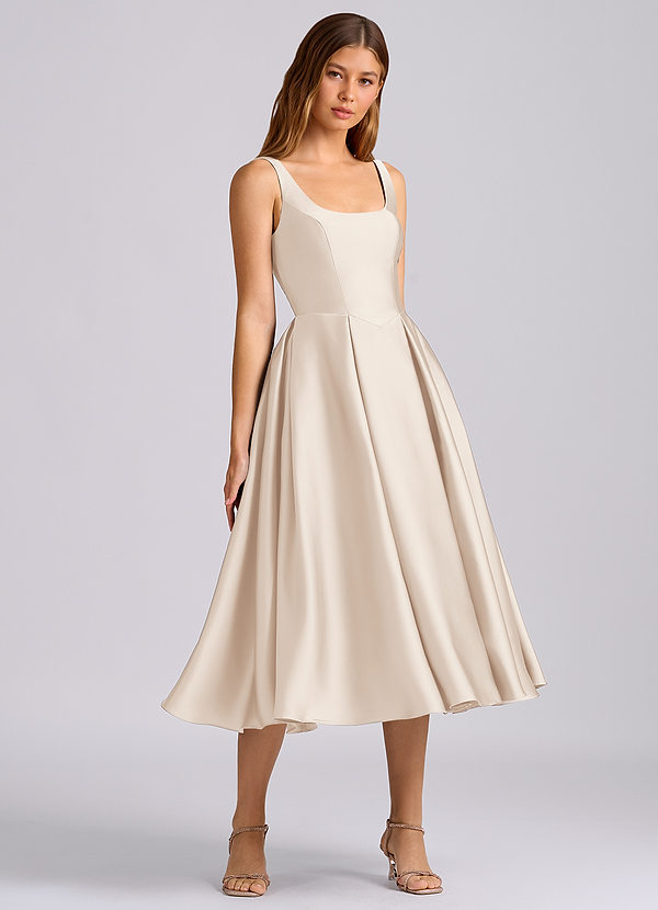 A라인 주름진 스트레치 새틴 티 길이 드레스