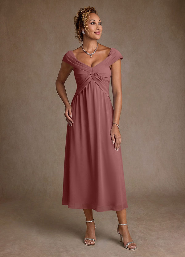 A라인 주름진 쉬폰 티 길이 드레스