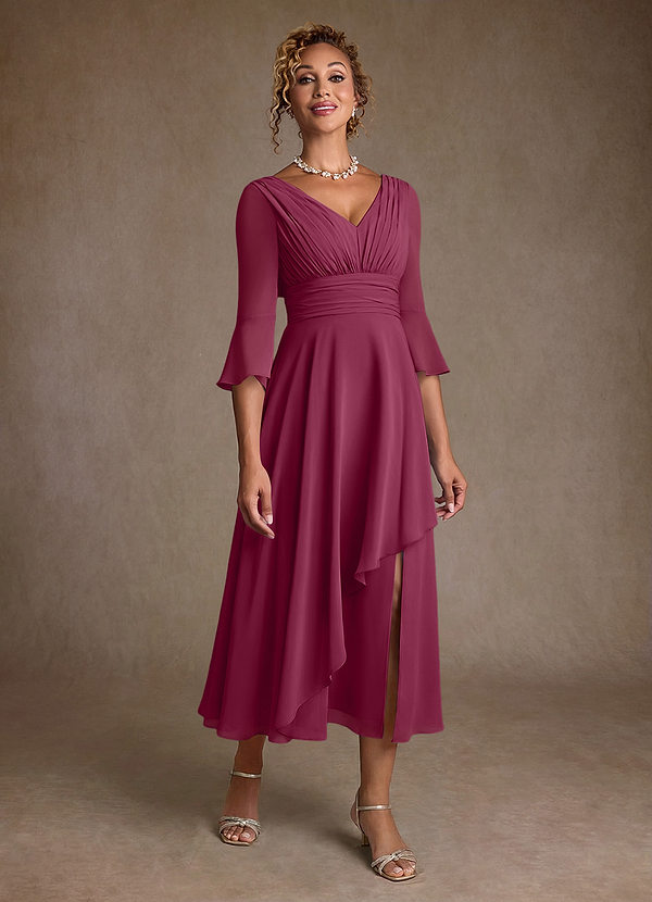A라인 주름진 쉬폰 티 길이 드레스