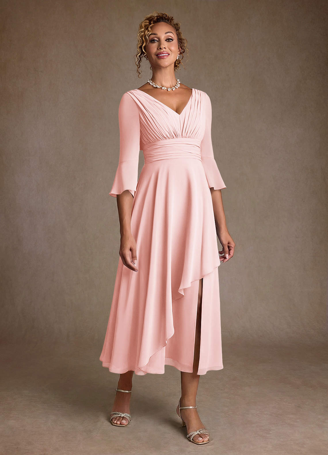 Azazie Aerynne 신부의 어머니 드레스 A라인 주름진 쉬폰 티 길이 드레스 image1