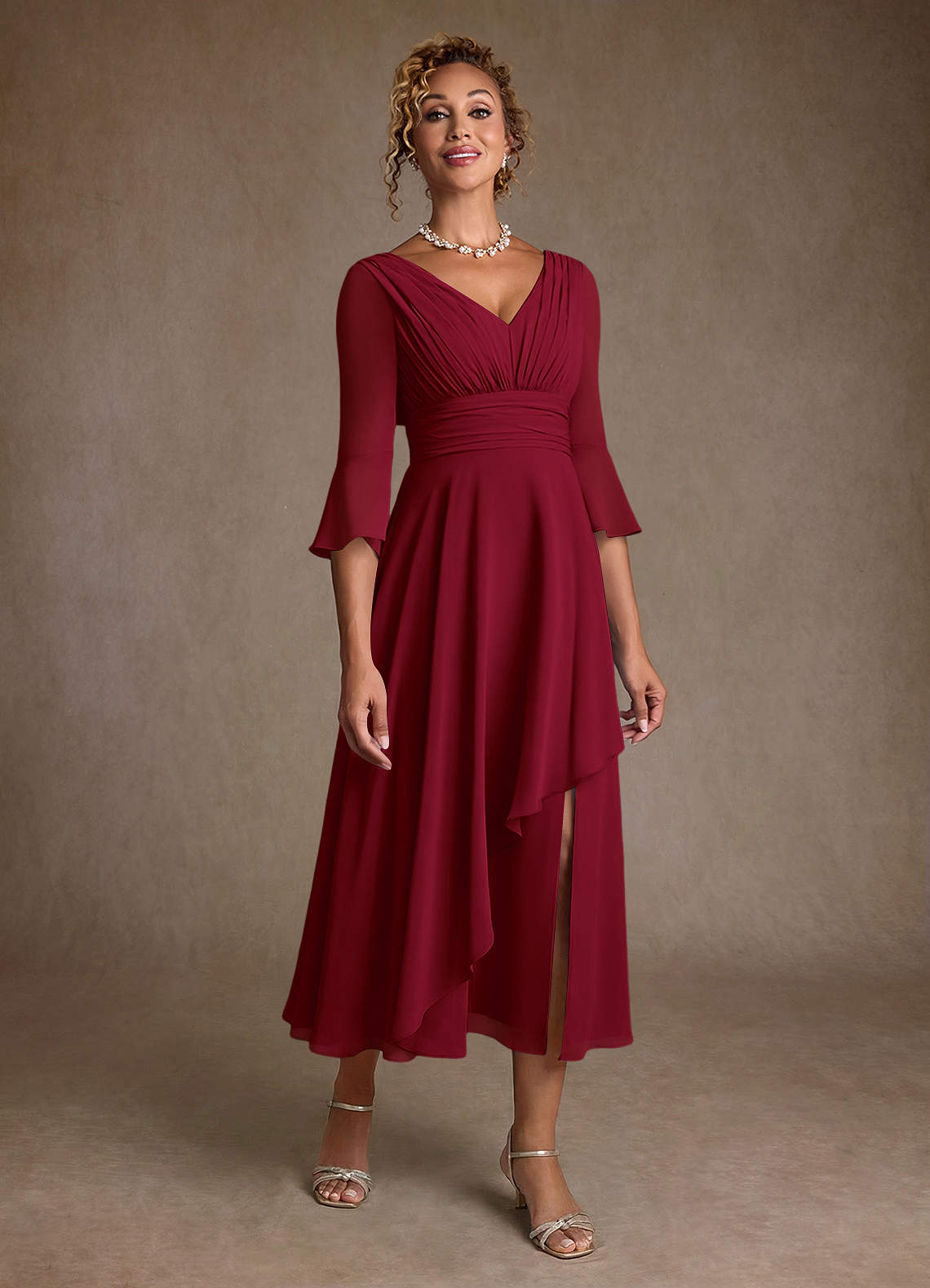 A라인 주름진 쉬폰 티 길이 드레스