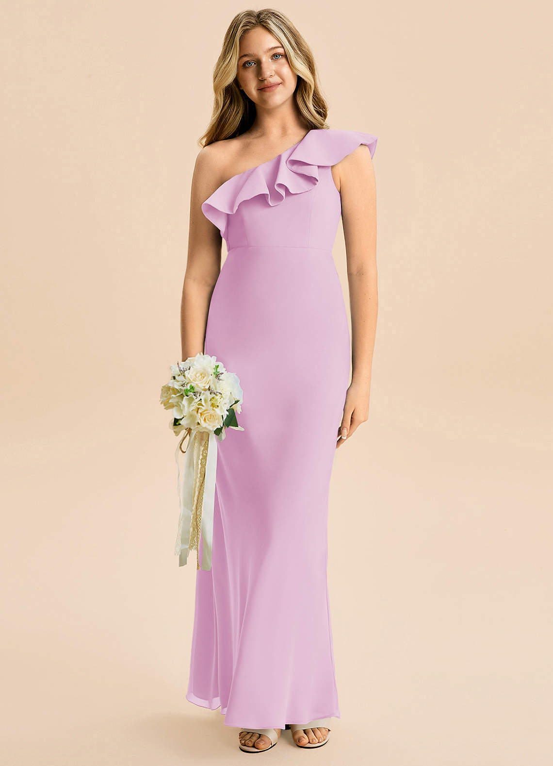 A라인 셔링 쉬폰 플로어 길이 주니어 신부 들러리 드레스