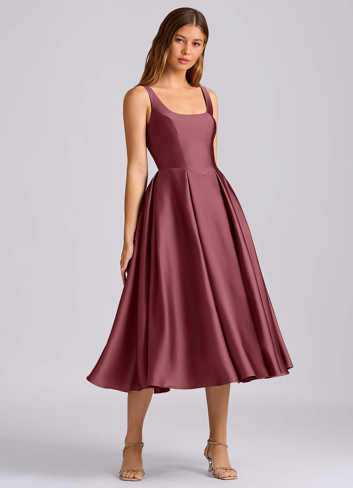 A라인 주름진 스트레치 새틴 티 길이 드레스