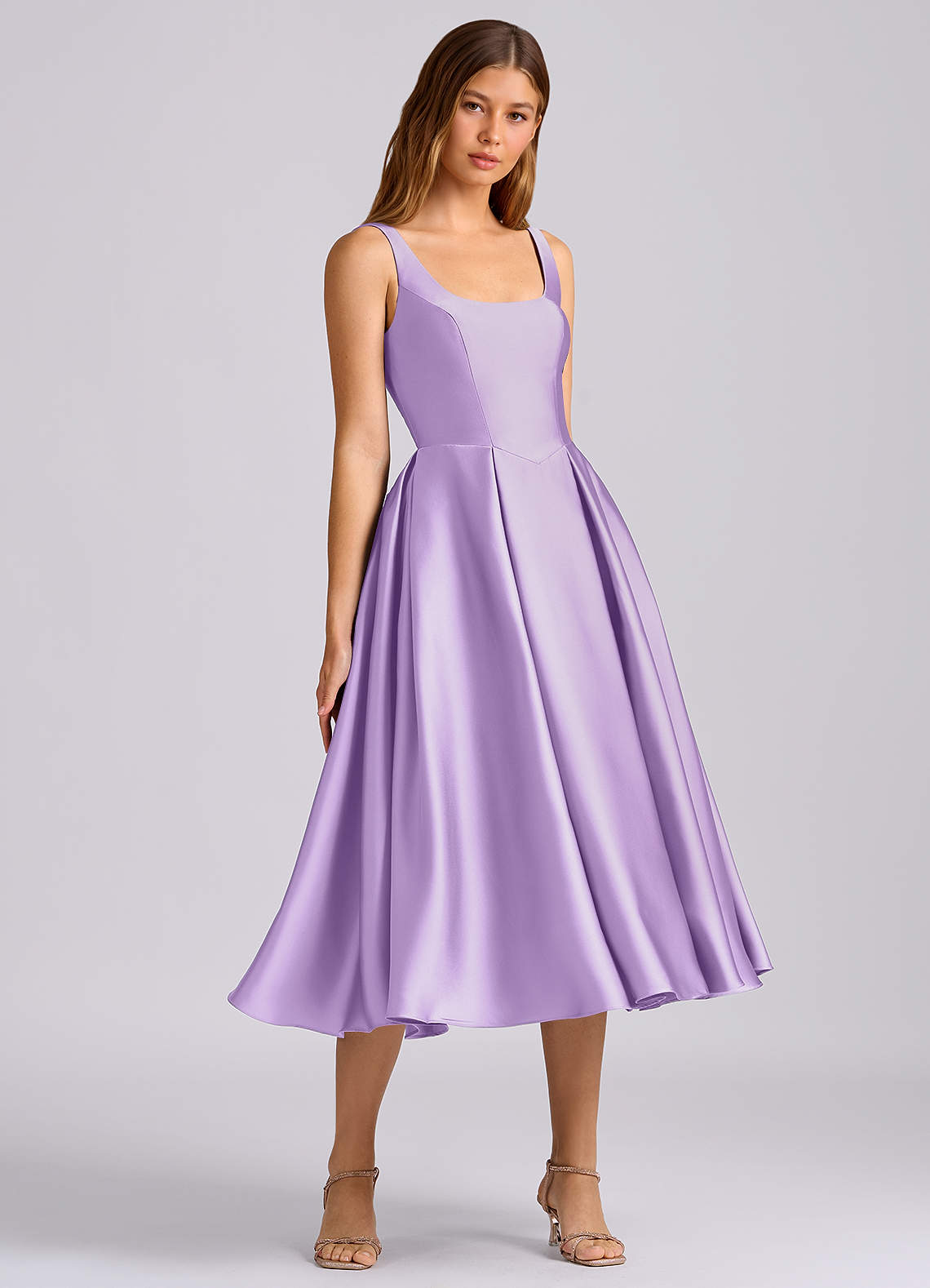 A라인 주름진 스트레치 새틴 티 길이 드레스