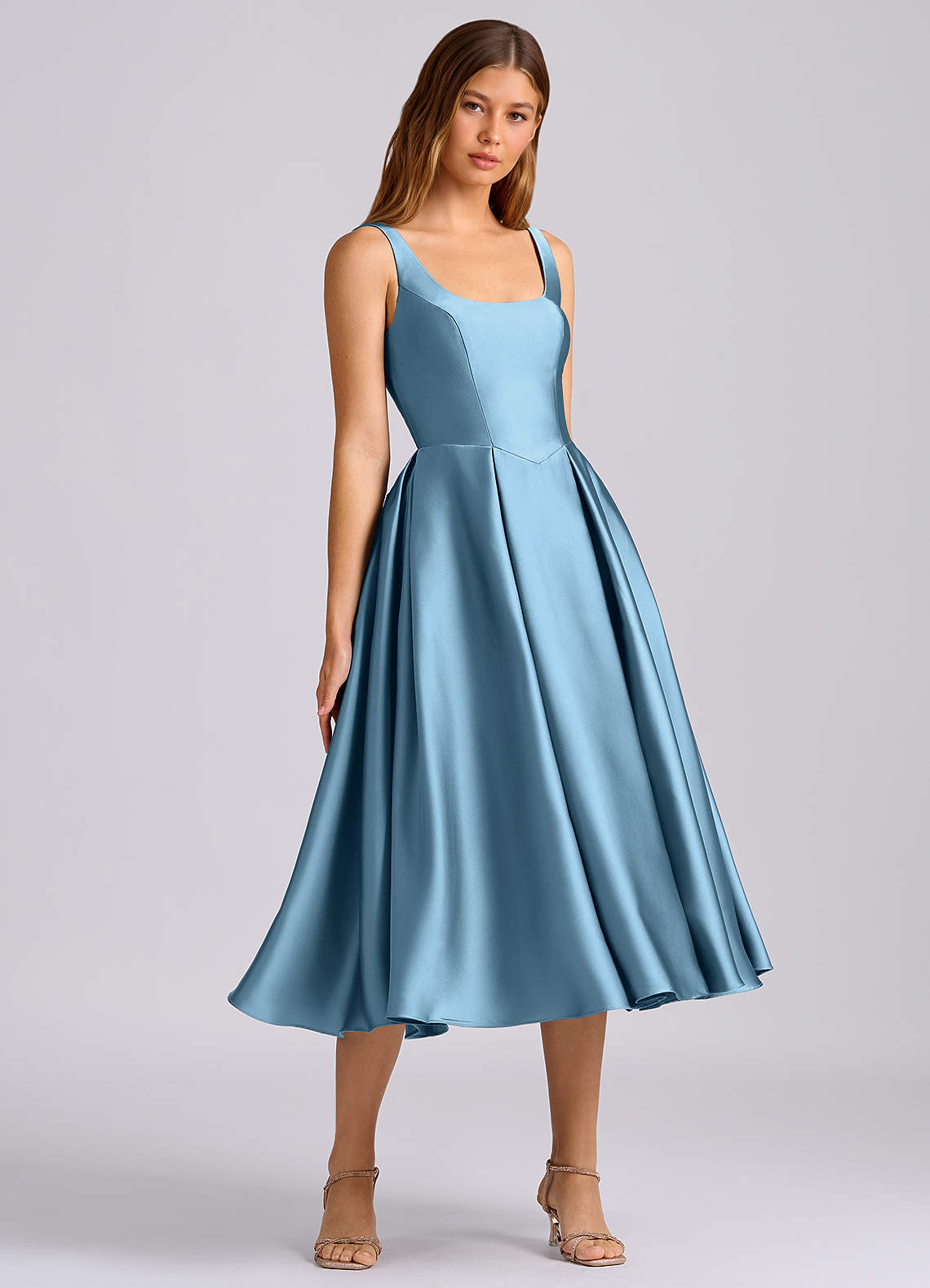 A라인 주름진 스트레치 새틴 티 길이 드레스
