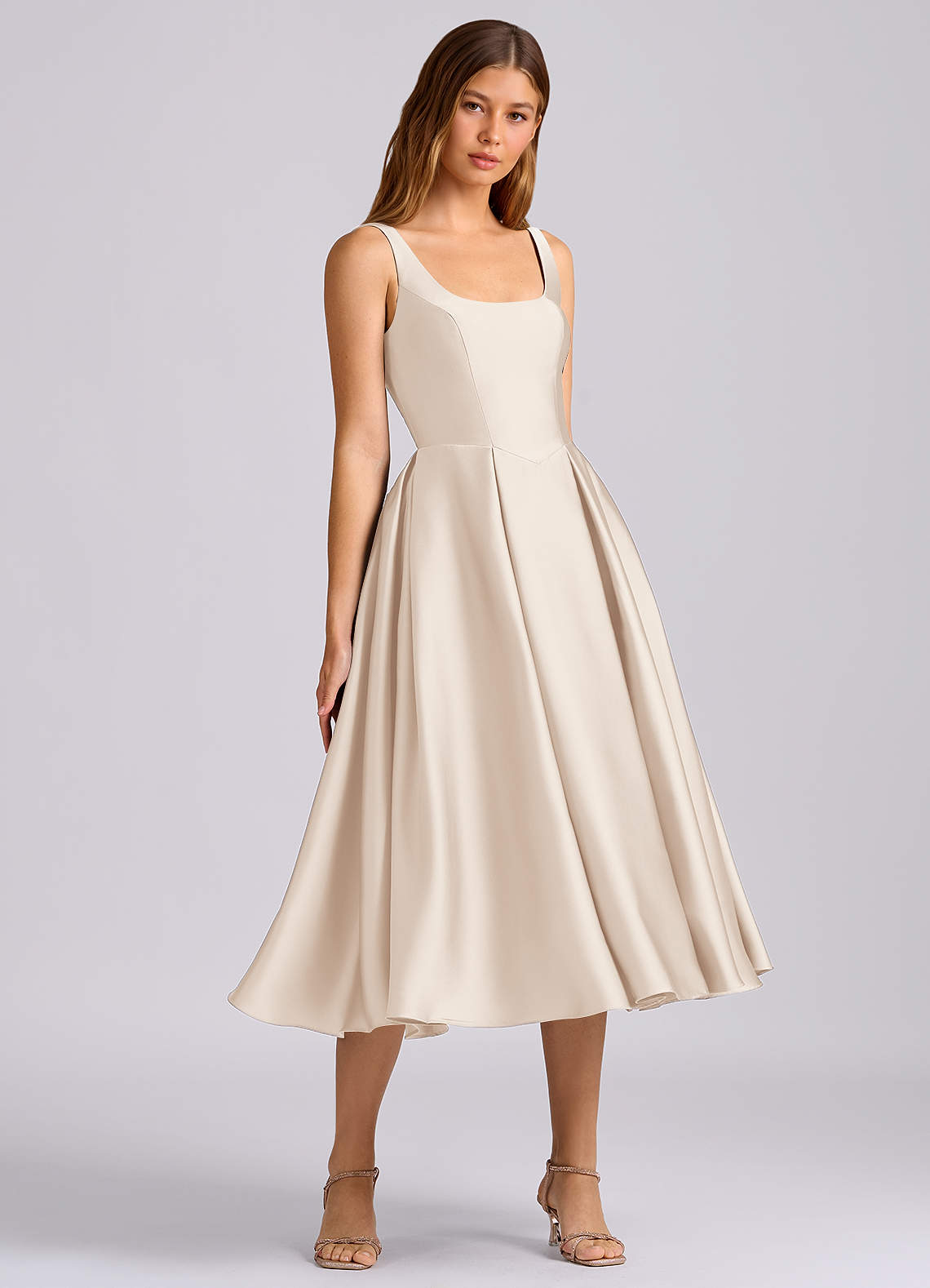 A라인 주름진 스트레치 새틴 티 길이 드레스