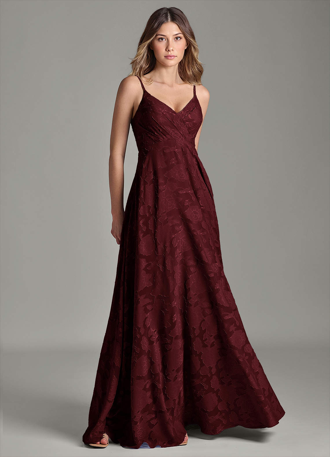 Azazie Amani 신부 들러리 드레스 A라인 주름진 플로럴 번아웃 바닥 길이 드레스 image1