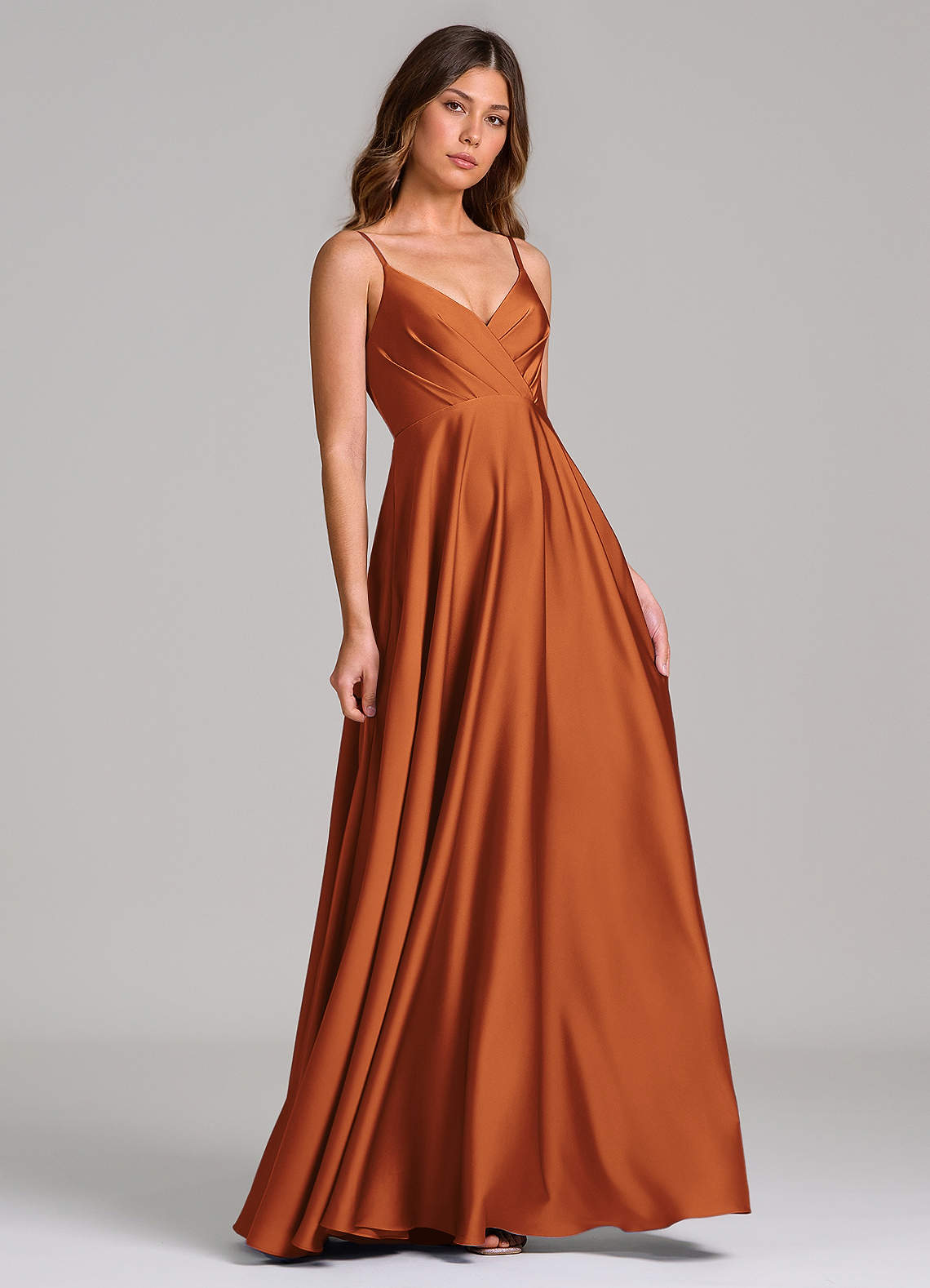 A라인 주름진 스트레치 새틴 바닥 길이 드레스