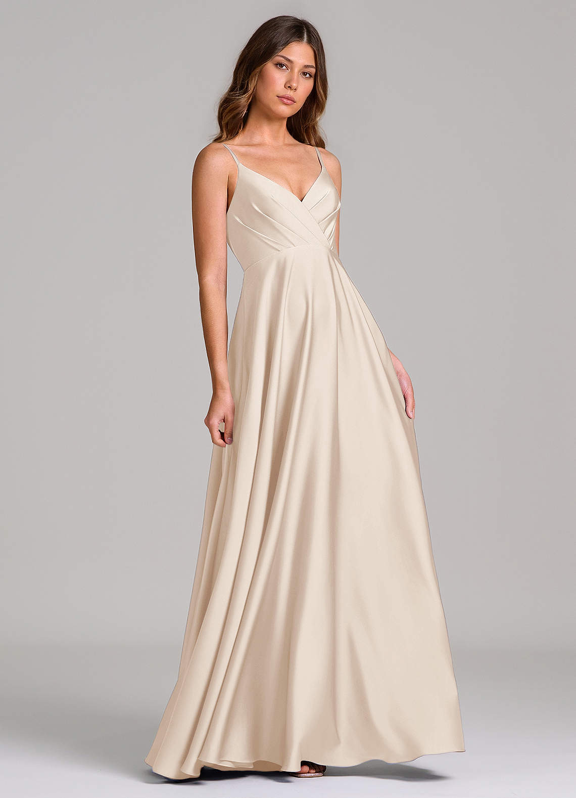 A라인 주름진 스트레치 새틴 바닥 길이 드레스