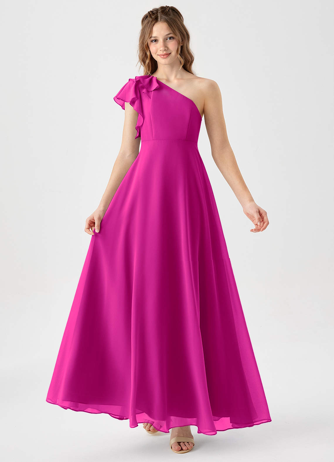 A라인 셔링 쉬폰 플로어 길이 주니어 신부 들러리 드레스