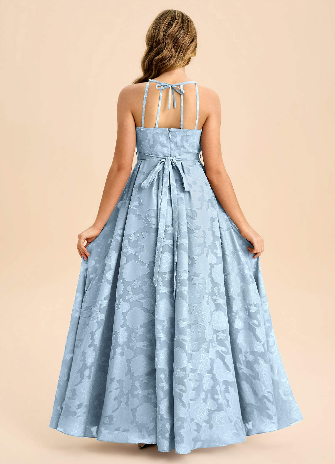 A라인 주름진 플로럴 번아웃 플로어 길이 주니어 신부 들러리 드레스