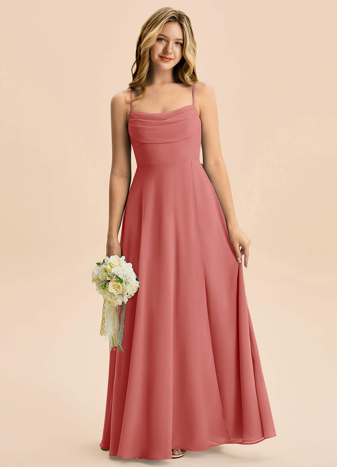 A라인 주름진 쉬폰 플로어 길이 주니어 신부 들러리 드레스