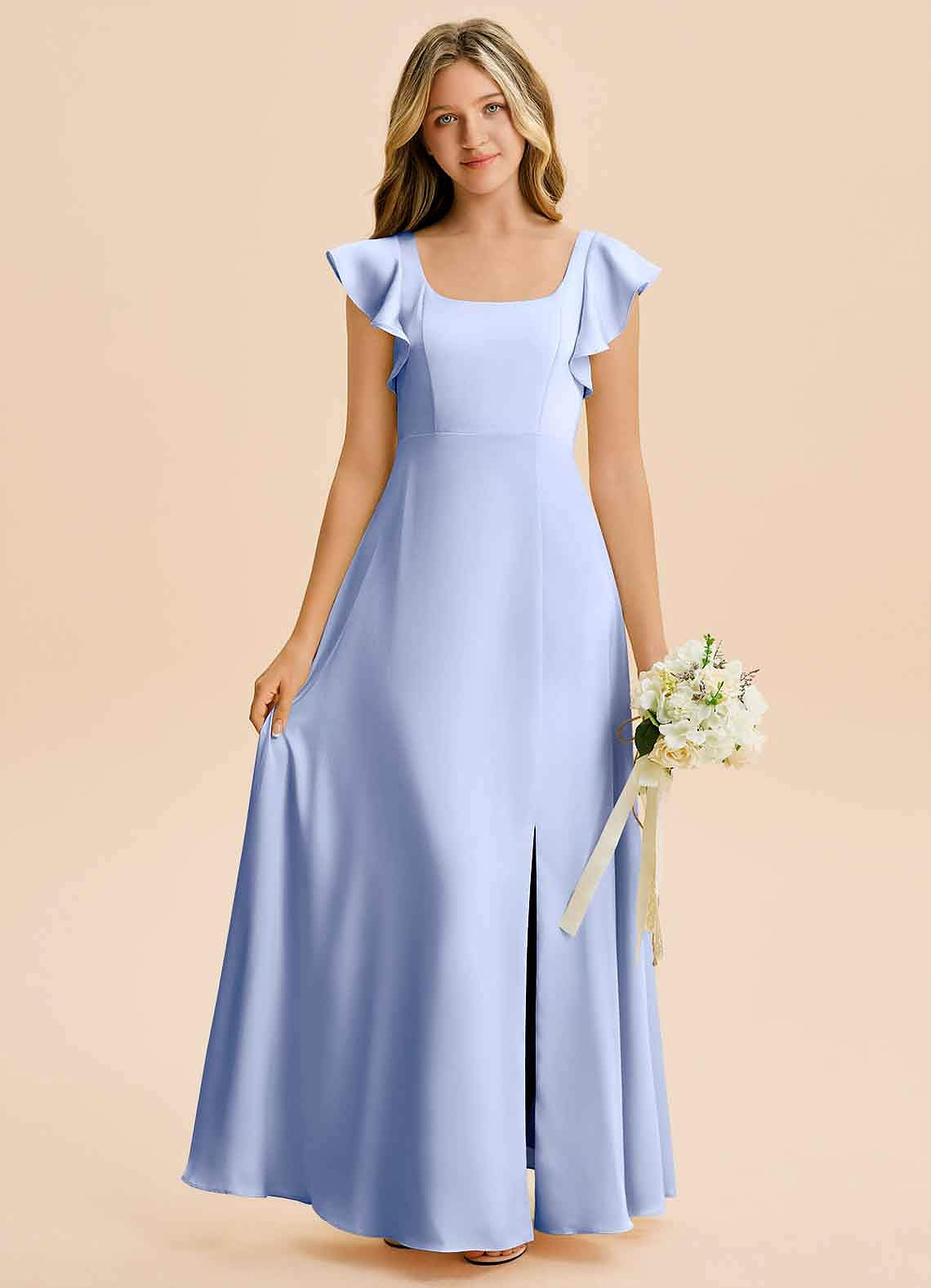 A라인 사이드 슬릿 스트레치 새틴 플로어 길이 주니어 신부 들러리 드레스
