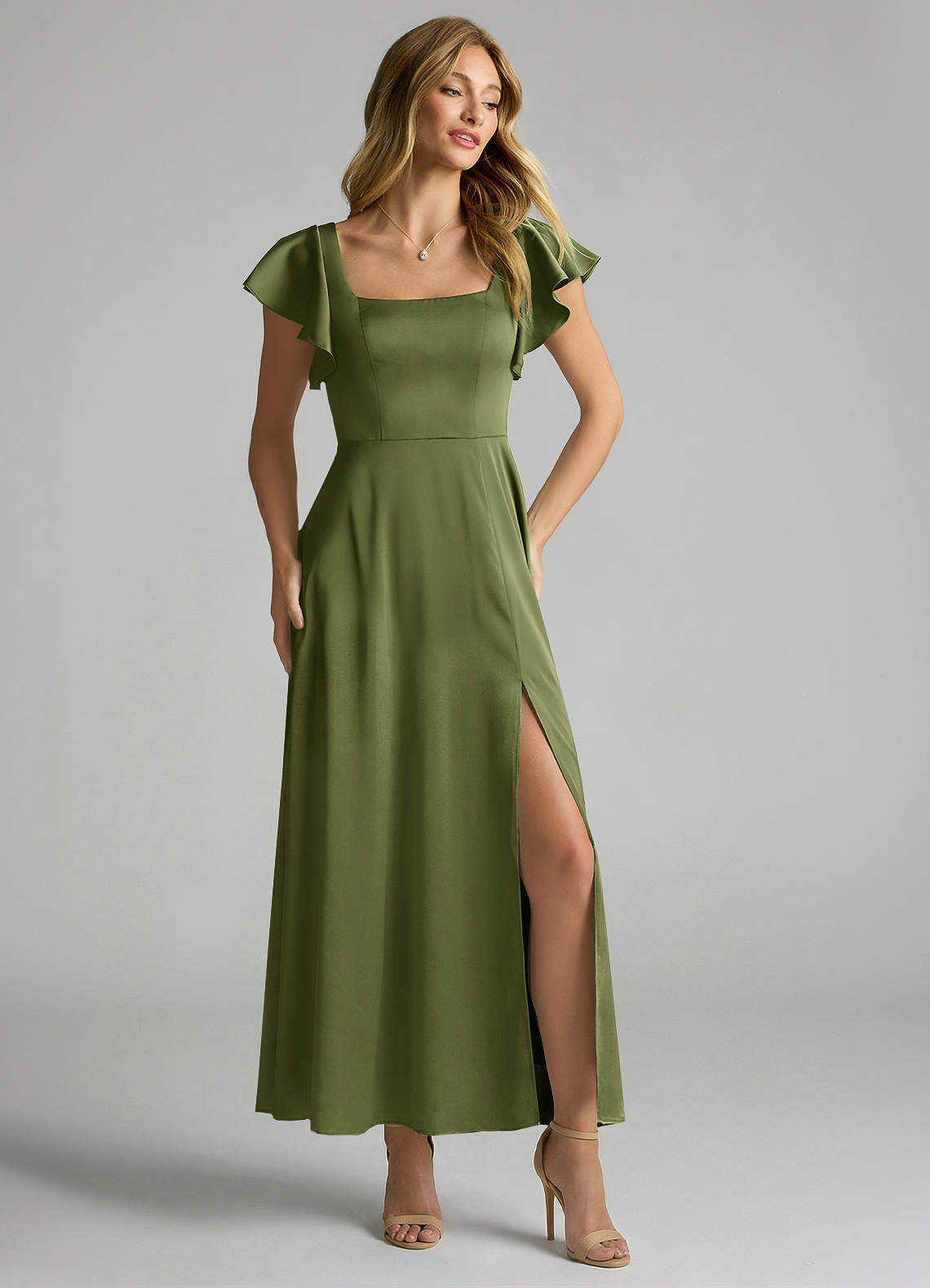 A라인 셔링 스트레치 새틴 발목 길이 드레스