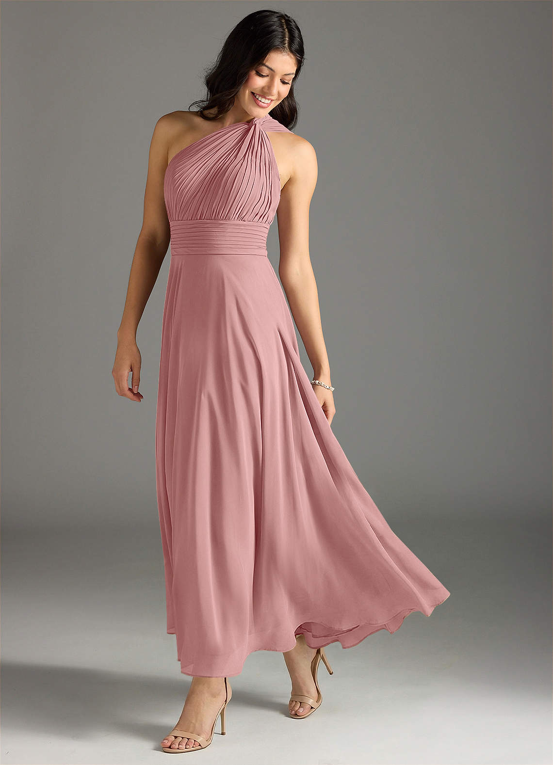 Azazie Charlize 신부 들러리 드레스 A라인 한쪽 어깨 쉬폰 발목 길이 드레스 image1