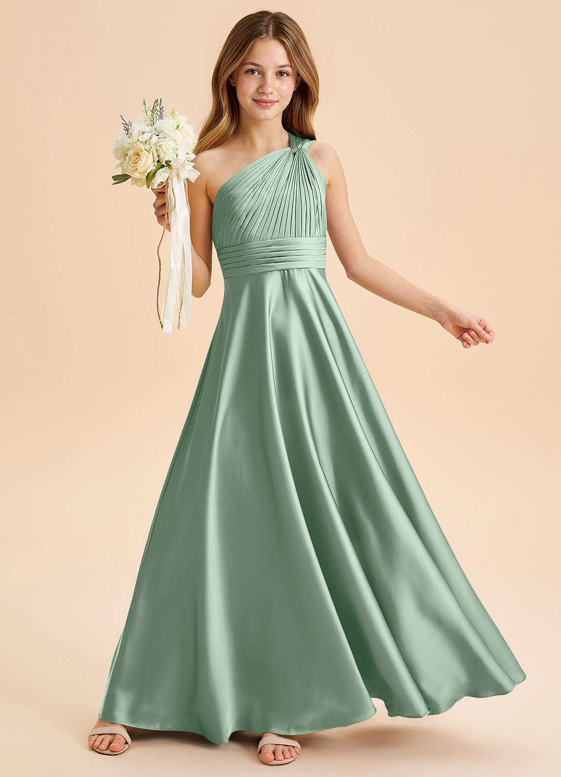 A라인 주름진 스트레치 새틴 플로어 길이 주니어 신부 들러리 드레스