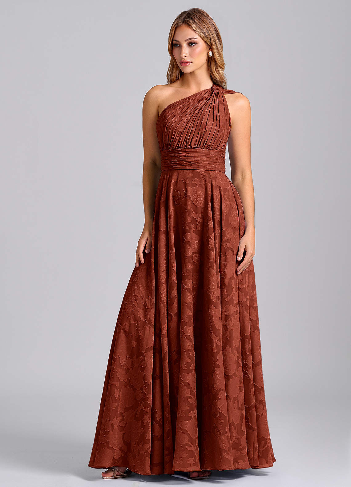 A라인 한쪽 어깨 플로럴 번아웃 바닥 길이 드레스