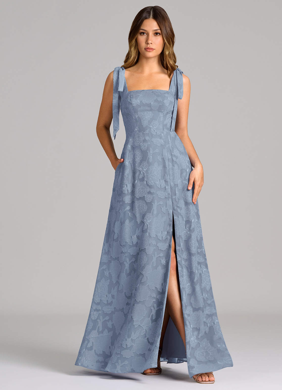 Azazie Debra 신부 들러리 드레스 A라인 포켓이 있는 플로럴 번아웃 바닥 길이 드레스 image1