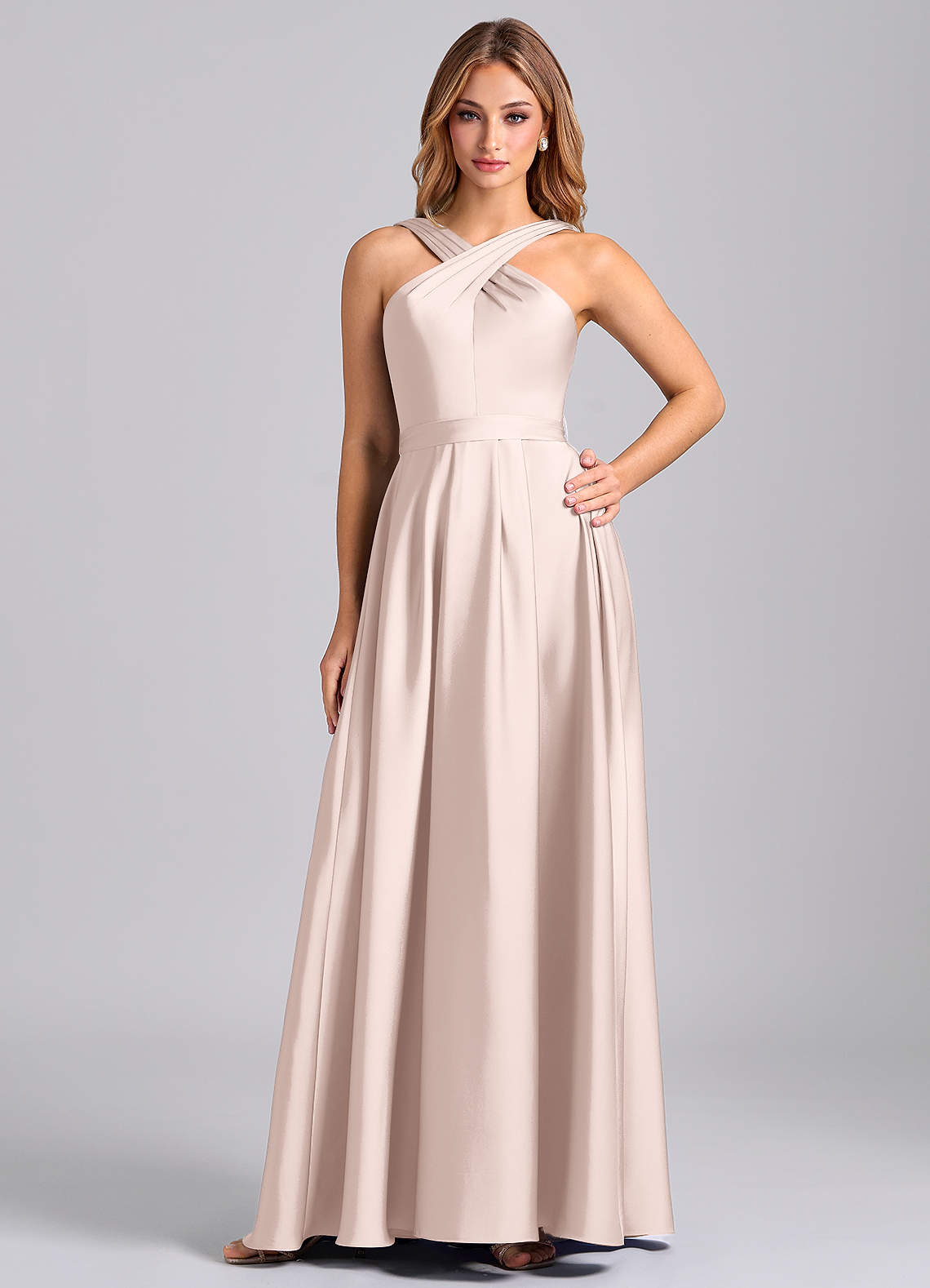 A라인 주름진 스트레치 새틴 바닥 길이 드레스