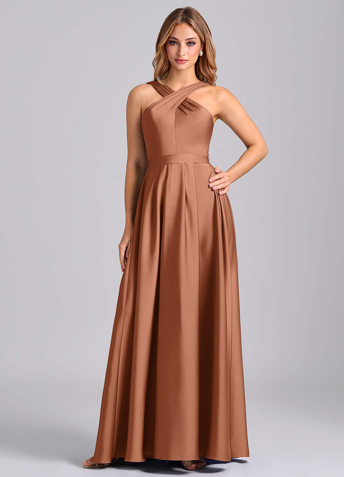 A라인 주름진 스트레치 새틴 바닥 길이 드레스