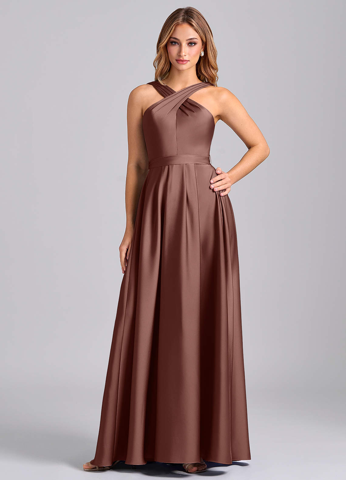 A라인 주름진 스트레치 새틴 바닥 길이 드레스