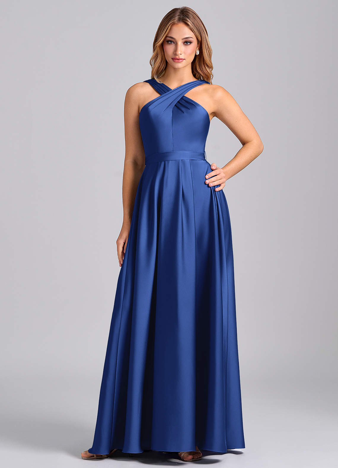 Azazie Dixie 신부 들러리 드레스 A라인 주름진 스트레치 새틴 바닥 길이 드레스 image1