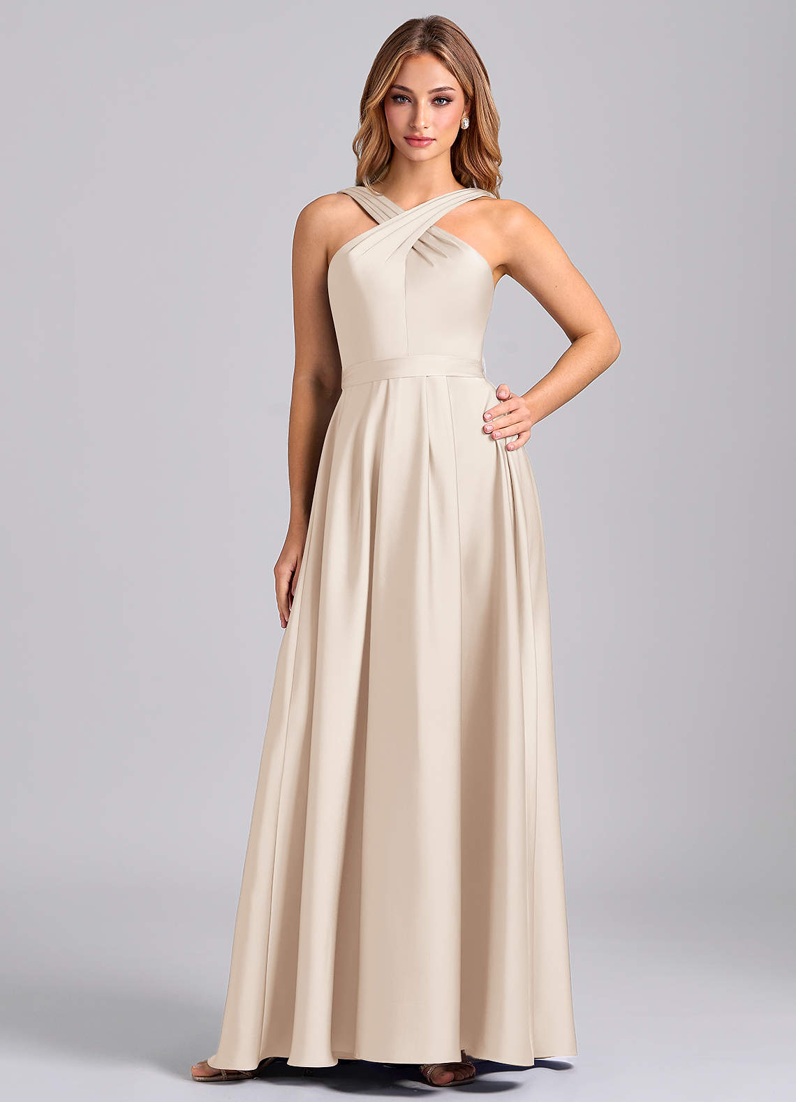 Azazie Dixie 신부 들러리 드레스 A라인 주름진 스트레치 새틴 바닥 길이 드레스 image1